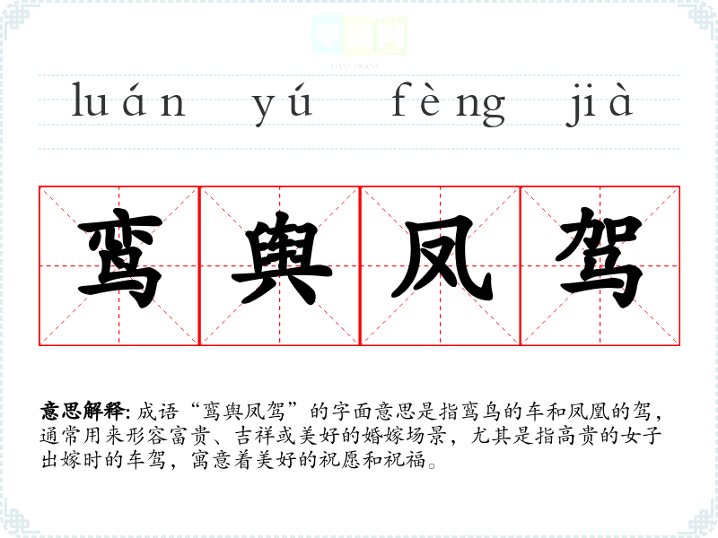 成语“鸾舆凤驾”的字面意思是指鸾鸟的车和凤凰的驾,通常用来形容富贵、吉祥或美好的婚嫁场景,尤其是指高贵的女子出嫁时的车驾,寓意着美好的祝愿和祝福。