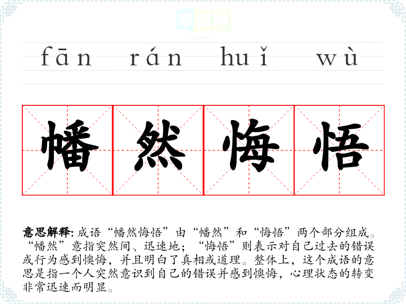 成语“幡然悔悟”由“幡然”和“悔悟”两个部分组成。“幡然”意指突然间、迅速地;“悔悟”则表示对自己过去的错误或行为感到懊悔,并且明白了真相或道理。整体上,这个成语的意思是指一个人突然意识到自己的错误并感到懊悔,心理状态的转变非常迅速而明显。