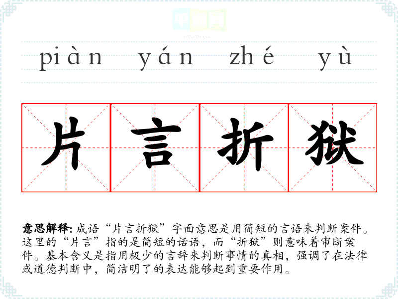 成语“片言折狱”字面意思是用简短的言语来判断案件。这里的“片言”指的是简短的话语,而“折狱”则意味着审断案件。基本含义是指用极少的言辞来判断事情的真相,强调了在法律或道德判断中,简洁明了的表达能够起到重要作用。
