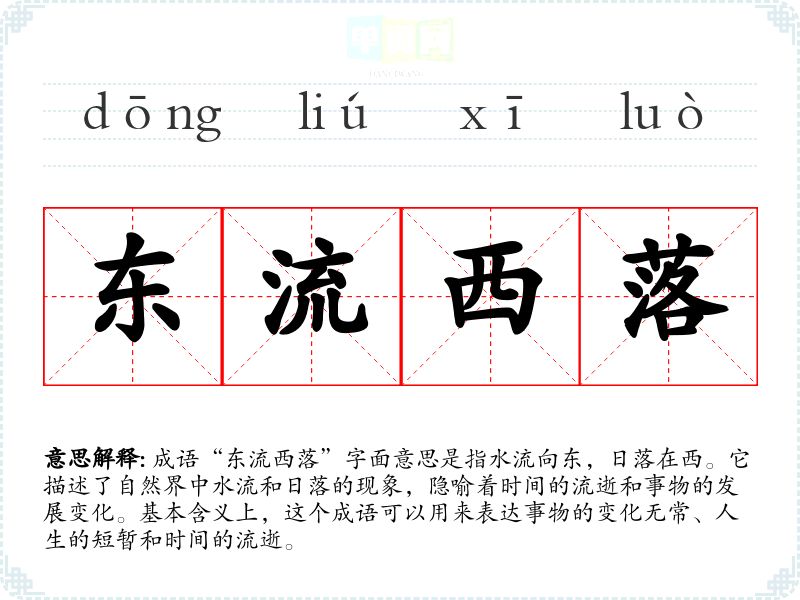 成语“东流西落”字面意思是指水流向东,日落在西。它描述了自然界中水流和日落的现象,隐喻着时间的流逝和事物的发展变化。基本含义上,这个成语可以用来表达事物的变化无常、人生的短暂和时间的流逝。