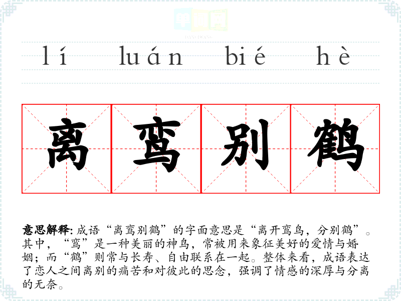 成语“离鸾别鹤”的字面意思是“离开鸾鸟,分别鹤”。其中,“鸾”是一种美丽的神鸟,常被用来象征美好的爱情与婚姻;而“鹤”则常与长寿、自由联系在一起。整体来看,成语表达了恋人之间离别的痛苦和对彼此的思念,强调了情感的深厚与分离的无奈。