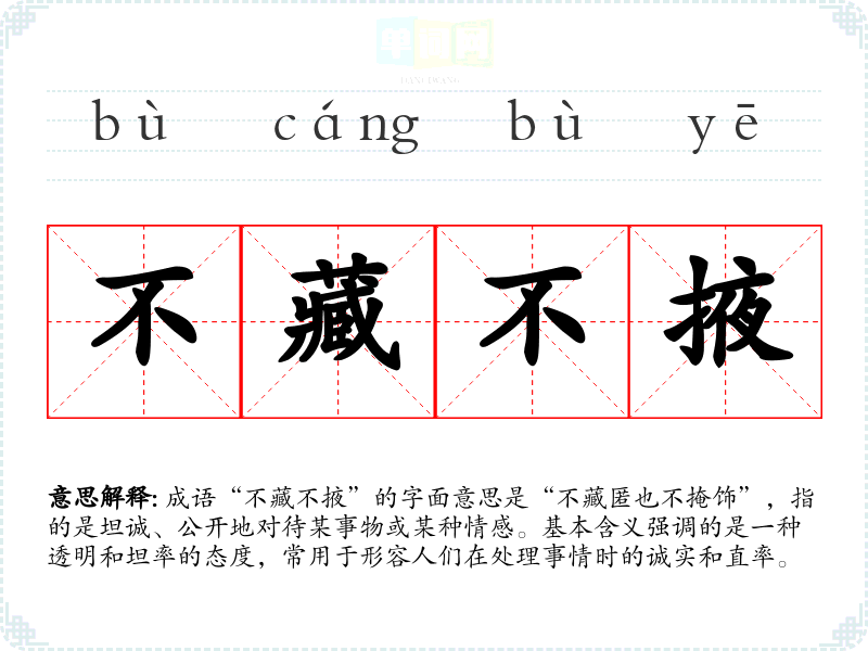 成语“不藏不掖”的字面意思是“不藏匿也不掩饰”,指的是坦诚、公开地对待某事物或某种情感。基本含义强调的是一种透明和坦率的态度,常用于形容人们在处理事情时的诚实和直率。