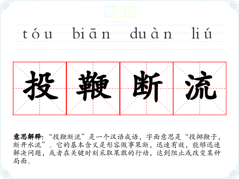 “投鞭断流”是一个汉语成语,字面意思是“投掷鞭子,断开水流”。它的基本含义是形容做事果断,迅速有效,能够迅速解决问题,或者在关键时刻采取果敢的行动,达到阻止或改变某种局面。