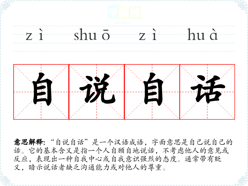 “自说自话”是一个汉语成语,字面意思是自己说自己的话。它的基本含义是指一个人自顾自地说话,不考虑他人的意见或反应,表现出一种自我中心或自我意识强烈的态度。通常带有贬义,暗示说话者缺乏沟通能力或对他人的尊重。