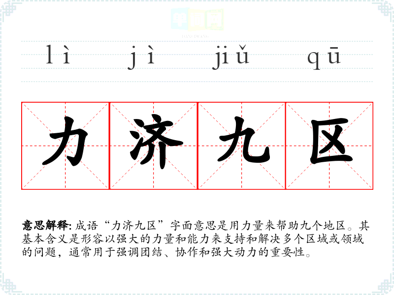 成语“力济九区”字面意思是用力量来帮助九个地区。其基本含义是形容以强大的力量和能力来支持和解决多个区域或领域的问题,通常用于强调团结、协作和强大动力的重要性。