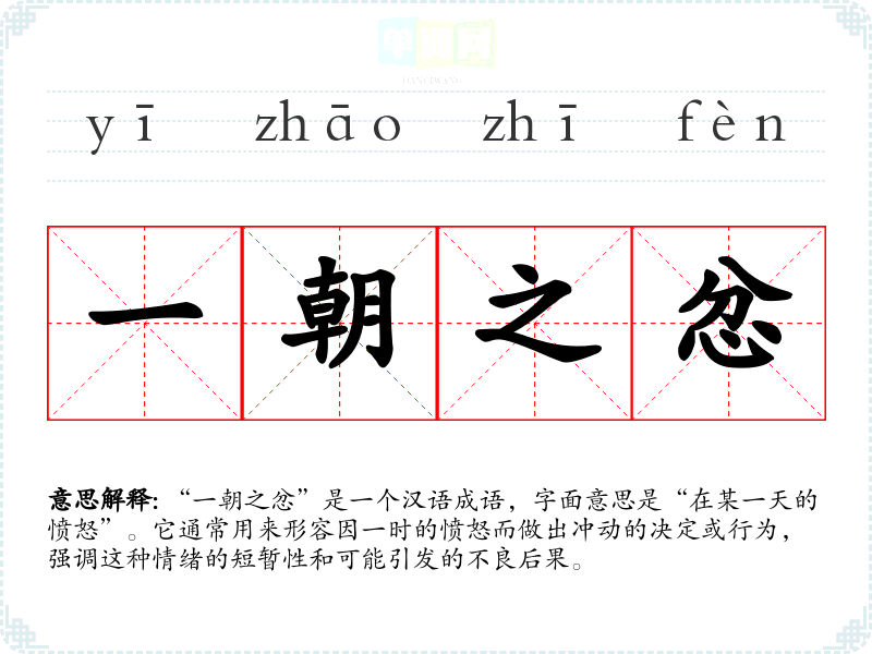 “一朝之忿”是一个汉语成语,字面意思是“在某一天的愤怒”。它通常用来形容因一时的愤怒而做出冲动的决定或行为,强调这种情绪的短暂性和可能引发的不良后果。