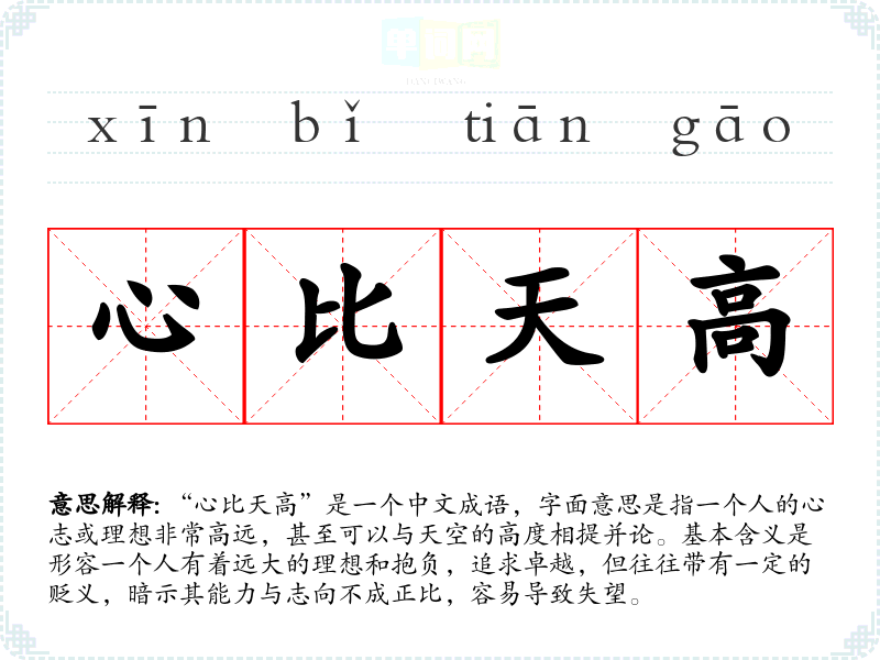 “心比天高”是一个中文成语,字面意思是指一个人的心志或理想非常高远,甚至可以与天空的高度相提并论。基本含义是形容一个人有着远大的理想和抱负,追求卓越,但往往带有一定的贬义,暗示其能力与志向不成正比,容易导致失望。