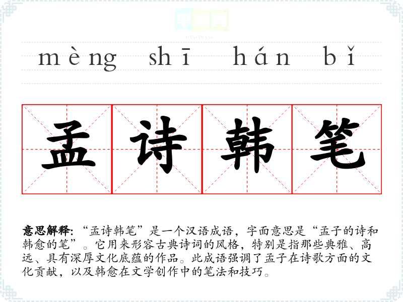 “孟诗韩笔”是一个汉语成语,字面意思是“孟子的诗和韩愈的笔”。它用来形容古典诗词的风格,特别是指那些典雅、高远、具有深厚文化底蕴的作品。此成语强调了孟子在诗歌方面的文化贡献,以及韩愈在文学创作中的笔法和技巧。