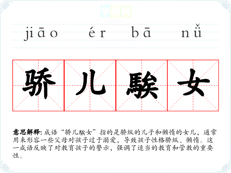成语“骄儿騃女”指的是骄纵的儿子和懒惰的女儿,通常用来形容一些父母对孩子过于溺爱,导致孩子性格骄纵、懒惰。这一成语反映了对教育孩子的警示,强调了适当的教育和管教的重要性。