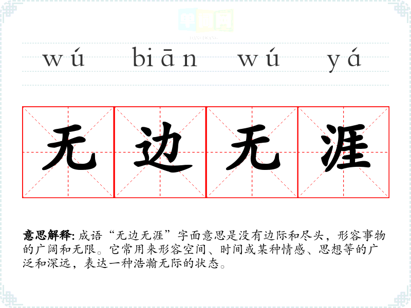 在文学作品中,“无边无涯”常用于描绘自然景观或抒发情感。在日常对话中,可能用来形容某种状态或感觉,如对某种理想的追求、对爱的深沉等。在演讲中,演讲者可以用此成语强调目标的宏伟或理想的崇高。