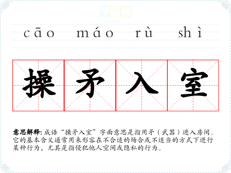 成语“操矛入室”字面意思是指用矛(武器)进入房间。它的基本含义通常用来形容在不合适的场合或不适当的方式下进行某种行为,尤其是指侵犯他人空间或隐私的行为。