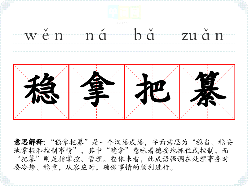 “稳拿把纂”是一个汉语成语,字面意思为“稳当、稳妥地掌握和控制事情”,其中“稳拿”意味着稳妥地抓住或控制,而“把纂”则是指掌控、管理。整体来看,此成语强调在处理事务时要冷静、稳重,从容应对,确保事情的顺利进行。