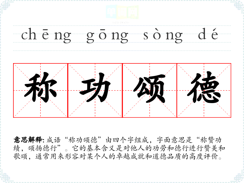 | 称功诵德 | 称:称道;功:功绩;德:德行。颂扬功绩和德行。 |