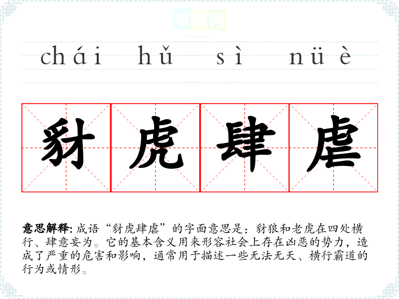 | 柴虎肆虐 | 豺、虎:两种凶残的野兽。比喻坏人像凶残的野兽一样横行不法。 |