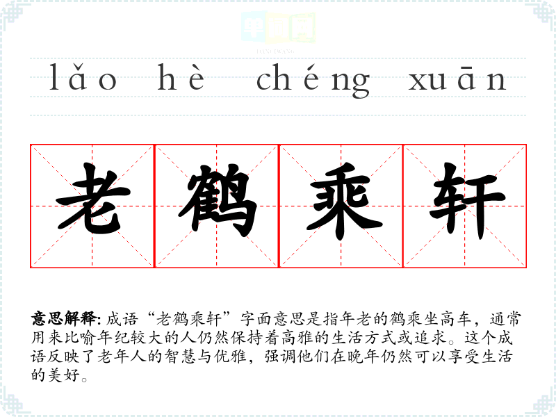 成语“老鹤乘轩”字面意思是指年老的鹤乘坐高车,通常用来比喻年纪较大的人仍然保持着高雅的生活方式或追求。这个成语反映了老年人的智慧与优雅,强调他们在晚年仍然可以享受生活的美好。