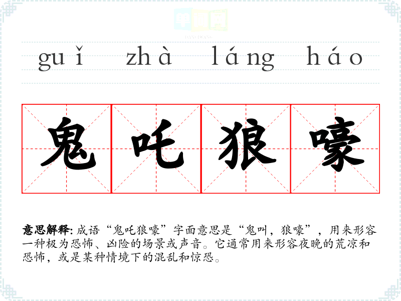 成语“鬼吒狼嚎”字面意思是“鬼叫,狼嚎”,用来形容一种极为恐怖、凶险的场景或声音。它通常用来形容夜晚的荒凉和恐怖,或是某种情境下的混乱和惊恐。