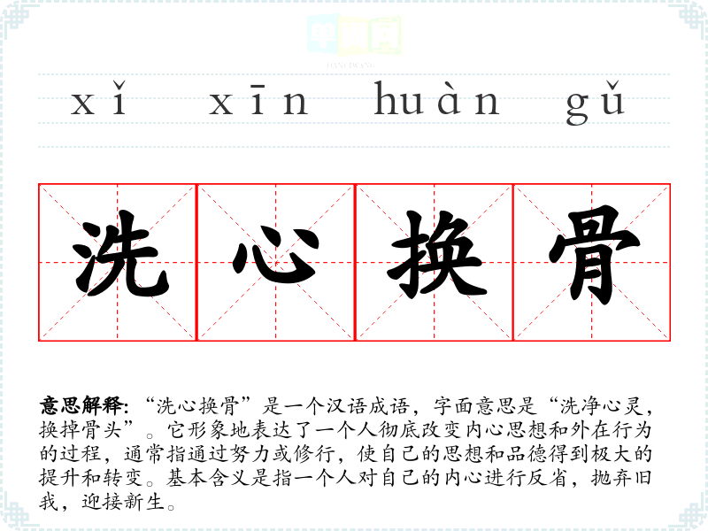 “洗心换骨”是一个汉语成语,字面意思是“洗净心灵,换掉骨头”。它形象地表达了一个人彻底改变内心思想和外在行为的过程,通常指通过努力或修行,使自己的思想和品德得到极大的提升和转变。基本含义是指一个人对自己的内心进行反省,抛弃旧我,迎接新生。