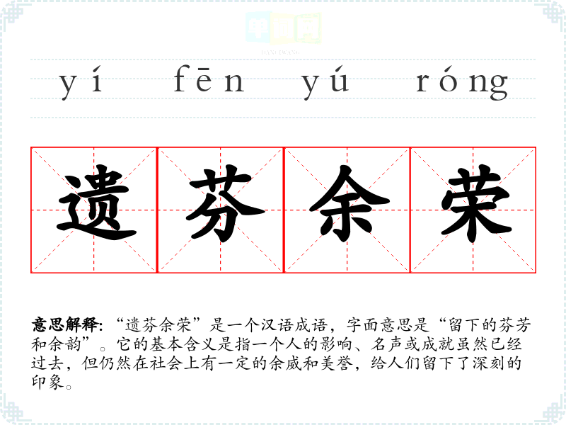 在**文化中,个人的名声和影响力被高度重视,尤其是在历史和伦理方面。成语“遗芬余荣”传递出一种对前辈的敬仰和对美德的追求,反映了社会对优秀品质的赞美和尊重。在现代社会,这个成语仍然适用,尤其是在企业文化、教育及社会责任等领域,强调个人或组织的长久影响。