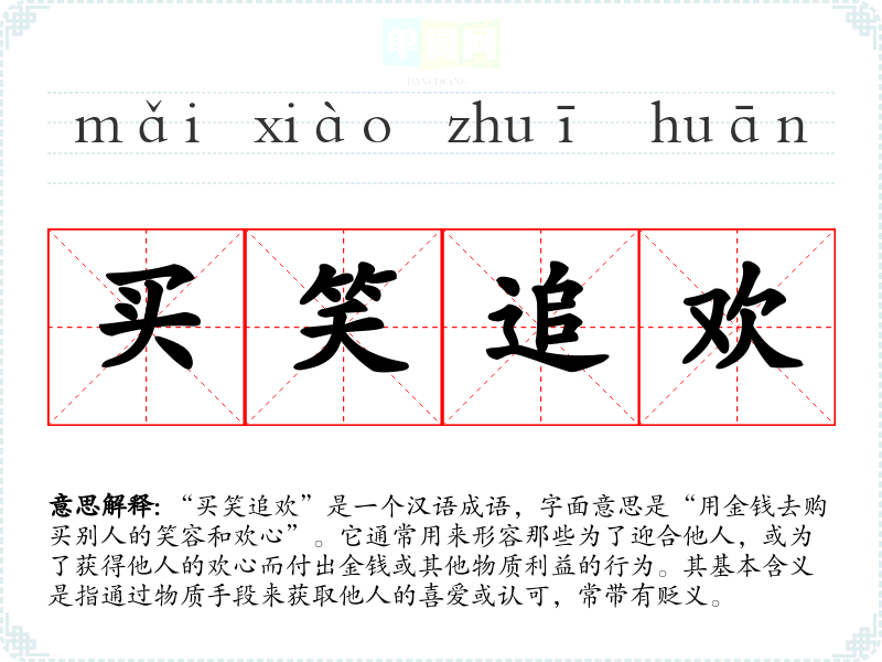 “买笑追欢”是一个汉语成语,字面意思是“用金钱去购买别人的笑容和欢心”。它通常用来形容那些为了迎合他人,或为了获得他人的欢心而付出金钱或其他物质利益的行为。其基本含义是指通过物质手段来获取他人的喜爱或认可,常带有贬义。