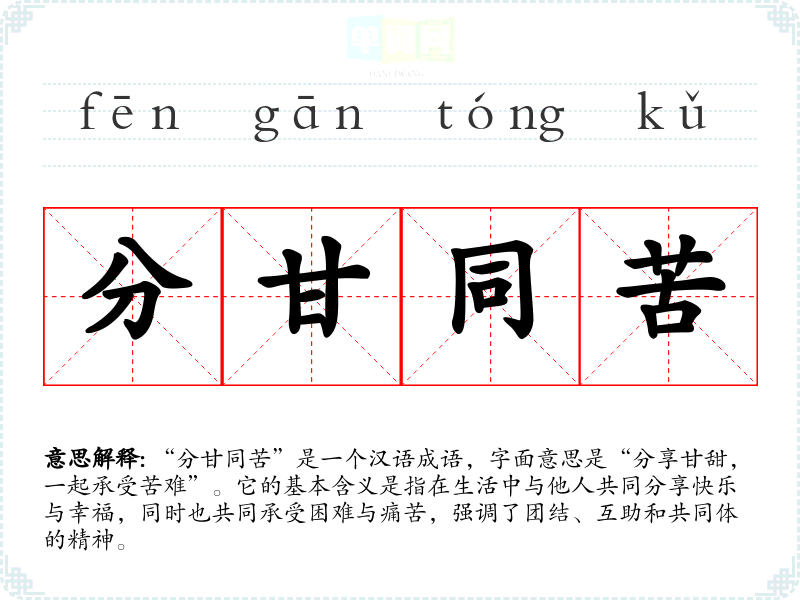 “分甘同苦”是一个汉语成语,字面意思是“分享甘甜,一起承受苦难”。它的基本含义是指在生活中与他人共同分享快乐与幸福,同时也共同承受困难与痛苦,强调了团结、互助和共同体的精神。