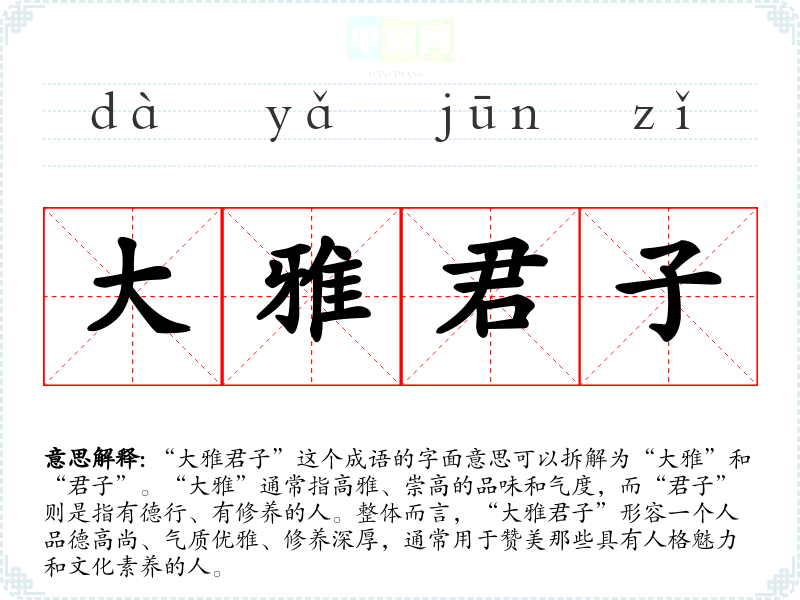 “大雅君子”这个成语的字面意思可以拆解为“大雅”和“君子”。“大雅”通常指高雅、崇高的品味和气度,而“君子”则是指有德行、有修养的人。整体而言,“大雅君子”形容一个人品德高尚、气质优雅、修养深厚,通常用于赞美那些具有人格魅力和文化素养的人。