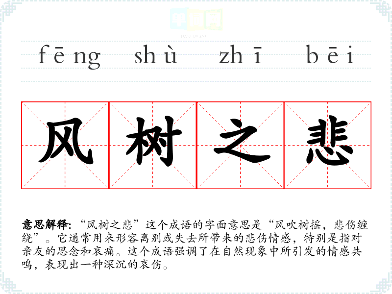 “风树之悲”这个成语的字面意思是“风吹树摇,悲伤缠绕”。它通常用来形容离别或失去所带来的悲伤情感,特别是指对亲友的思念和哀痛。这个成语强调了在自然现象中所引发的情感共鸣,表现出一种深沉的哀伤。