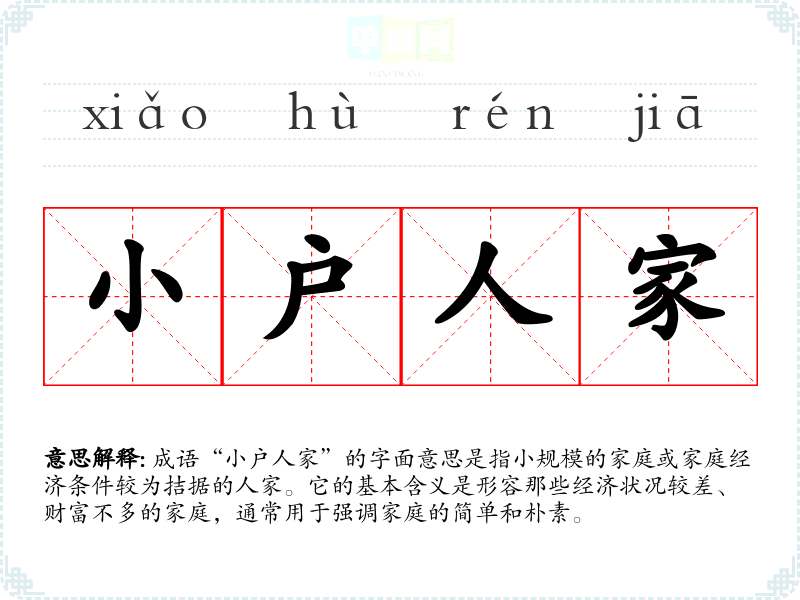 成语“小户人家”的字面意思是指小规模的家庭或家庭经济条件较为拮据的人家。它的基本含义是形容那些经济状况较差、财富不多的家庭,通常用于强调家庭的简单和朴素。