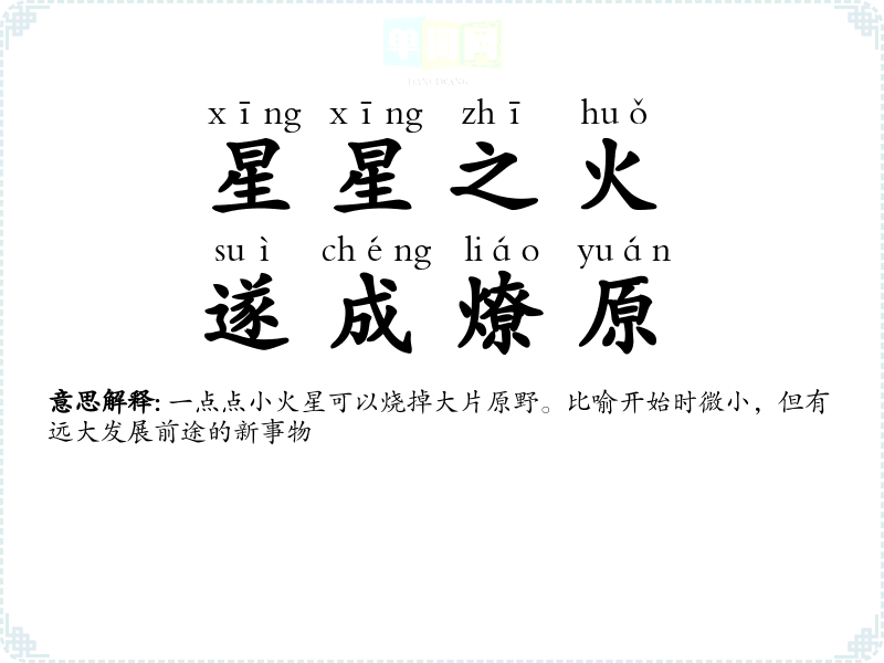 | 星星之火,遂成燎原 | 一点点小火星可以烧掉大片原野。比喻开始时微小,但有远大发展前途的新事物 |