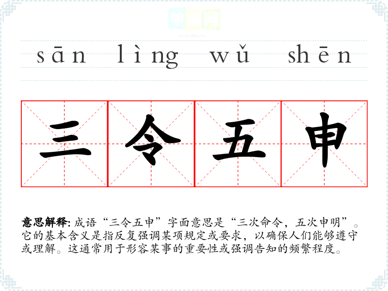 成语“三令五申”字面意思是“三次命令,五次申明”。它的基本含义是指反复强调某项规定或要求,以确保人们能够遵守或理解。这通常用于形容某事的重要性或强调告知的频繁程度。