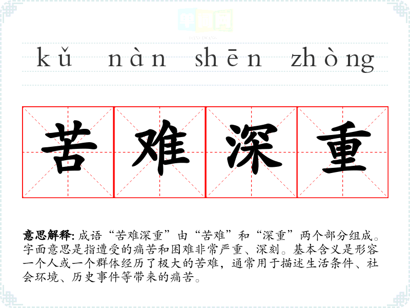 “苦难深重”并没有明确的历史典故或文学出处,但它的构成词汇在中文中有着悠久的使用历史。“苦难”指的是人们生活中所遭遇的痛苦与困苦,而“深重”则强调了其程度之深,常用于描述极为严峻的状态。该成语反映了人类在历史长河中所经历的种种磨难,尤其在动荡的时代背景下更为常见。
