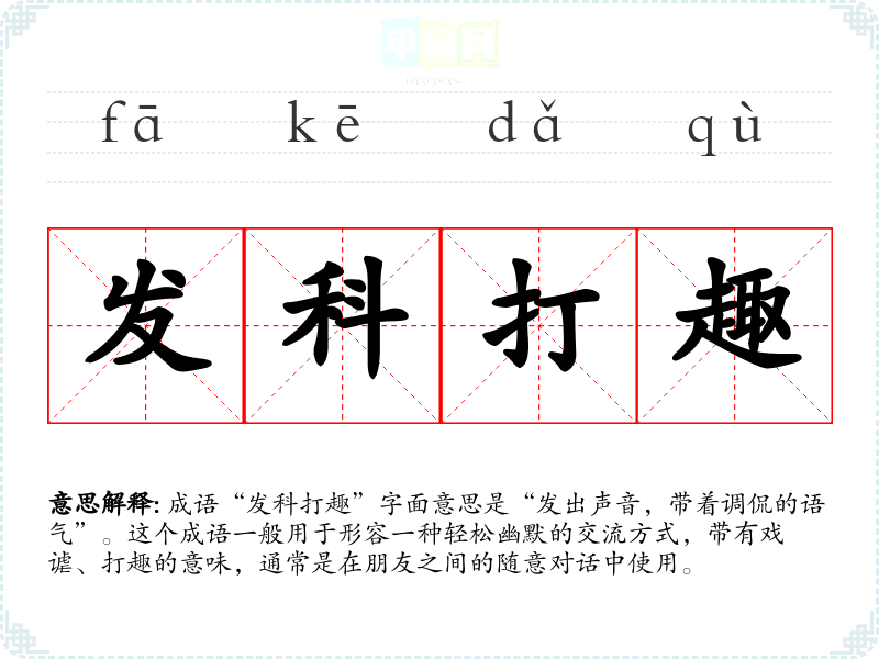 成语“发科打趣”字面意思是“发出声音,带着调侃的语气”。这个成语一般用于形容一种轻松幽默的交流方式,带有戏谑、打趣的意味,通常是在朋友之间的随意对话中使用。