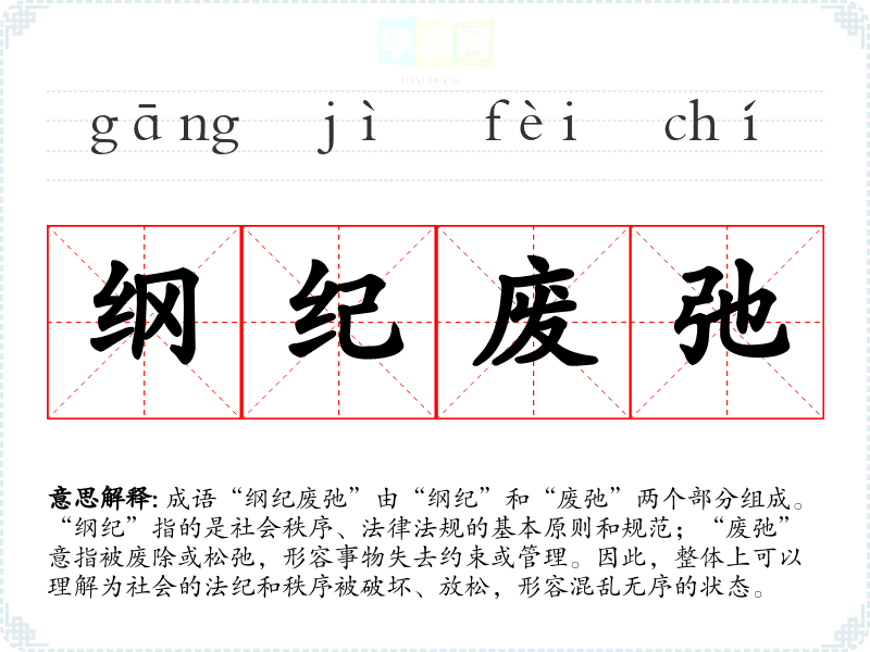 | 纲纪废弛 | 纲:政纲;纪:法纪;废弛:颓废松弛。国家的政纲、法纪、秩序松弛不振。 |
