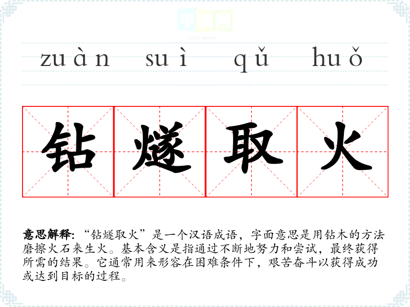 “钻燧取火”是一个汉语成语,字面意思是用钻木的方法磨擦火石来生火。基本含义是指通过不断地努力和尝试,最终获得所需的结果。它通常用来形容在困难条件下,艰苦奋斗以获得成功或达到目标的过程。
