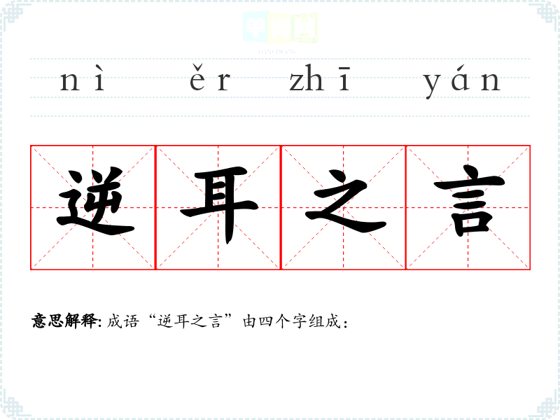 字面意思是指听到的话让人不愉快,通常用来形容那些虽然不讨人喜欢但却是忠告或真理的言语。基本含义是指对自己不利的劝告或批评,但往往是出于好意。