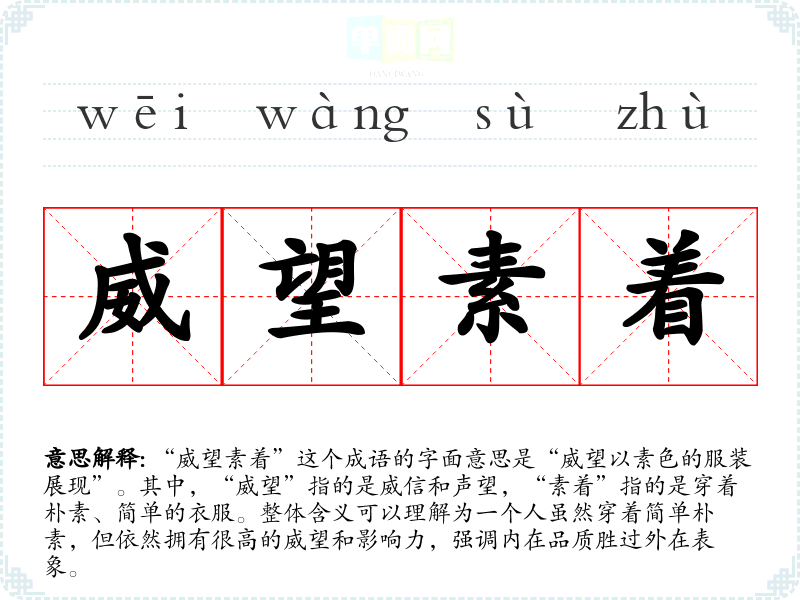 “威望素着”这个成语的字面意思是“威望以素色的服装展现”。其中,“威望”指的是威信和声望,“素着”指的是穿着朴素、简单的衣服。整体含义可以理解为一个人虽然穿着简单朴素,但依然拥有很高的威望和影响力,强调内在品质胜过外在表象。