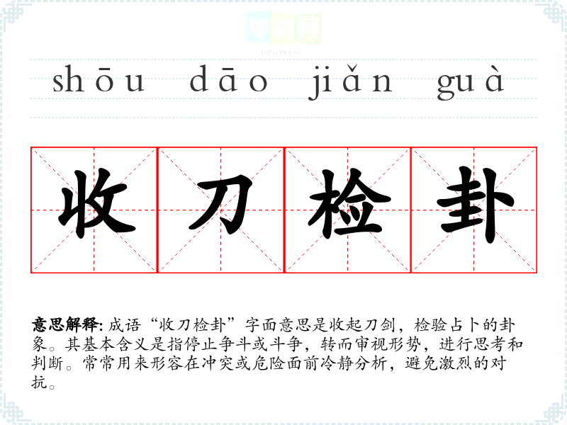 “收刀检卦”出自古代的卜卦文化,卦象是古人用来占卜的符号,象征着未来的变化和趋势。成语中的“刀”与“卦”形成鲜明对比,强调在面对不确定性时,应该放下武器,冷静思考而不是盲目对抗。虽然具体的出处可能不详,但与古代智者推算未来、洞悉人心的智慧密切相关。