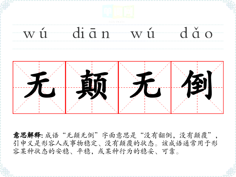 成语“无颠无倒”字面意思是“没有翻倒,没有颠覆”,引申义是形容人或事物稳定、没有颠覆的状态。该成语通常用于形容某种状态的安稳、平稳,或某种行为的稳妥、可靠。