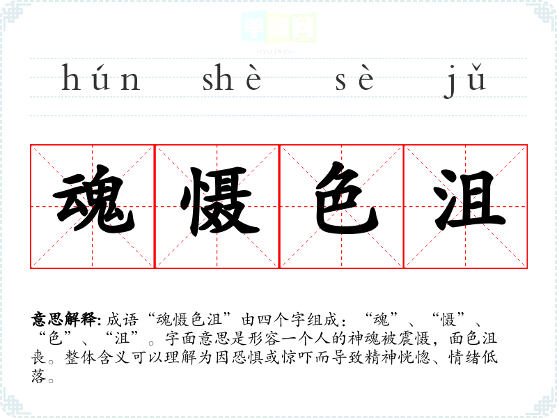 成语“魂慑色沮”由四个字组成:“魂”、“慑”、“色”、“沮”。字面意思是形容一个人的神魂被震慑,面色沮丧。整体含义可以理解为因恐惧或惊吓而导致精神恍惚、情绪低落。