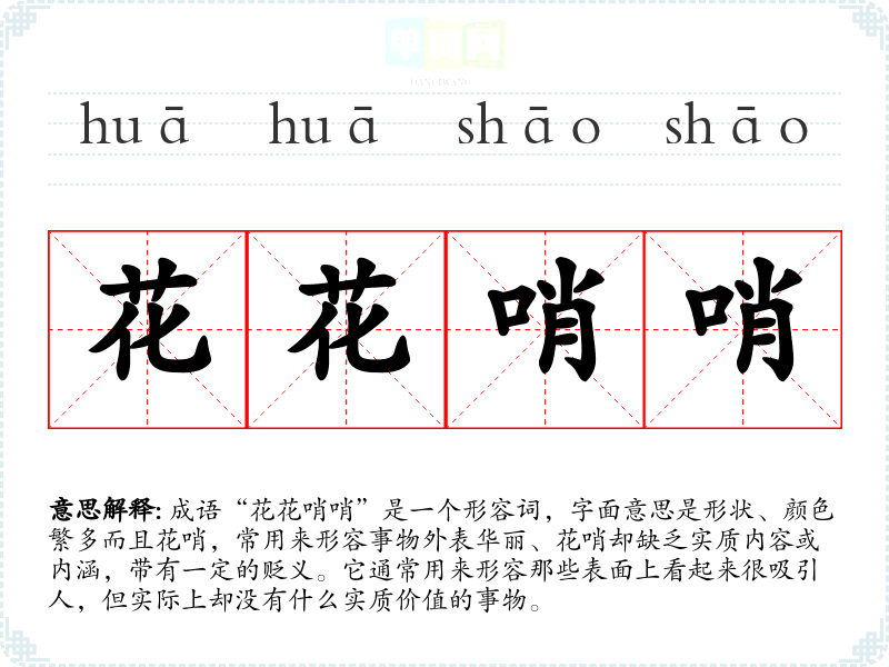 | 花里胡哨 | 形容颜色过分鲜艳繁杂。也比喻浮华而不实在。 |