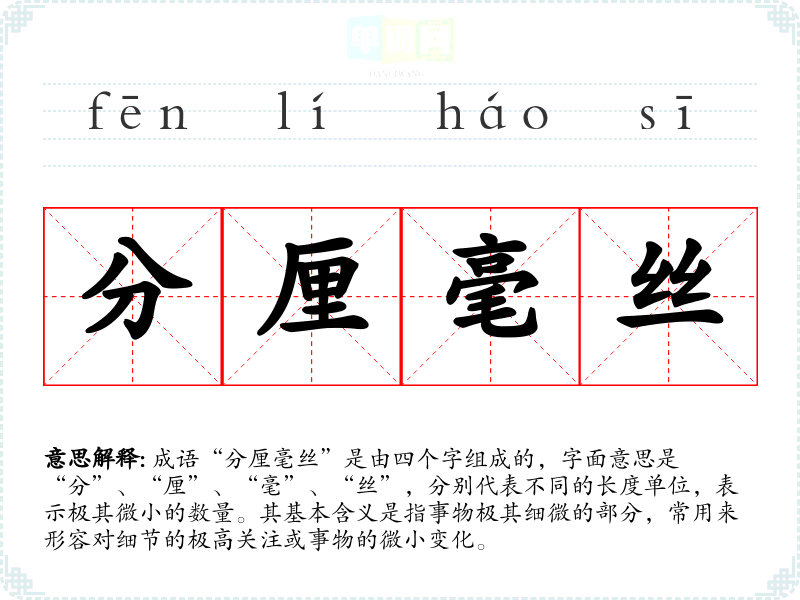 成语“分厘毫丝”是由四个字组成的,字面意思是“分”、“厘”、“毫”、“丝”,分别代表不同的长度单位,表示极其微小的数量。其基本含义是指事物极其细微的部分,常用来形容对细节的极高关注或事物的微小变化。