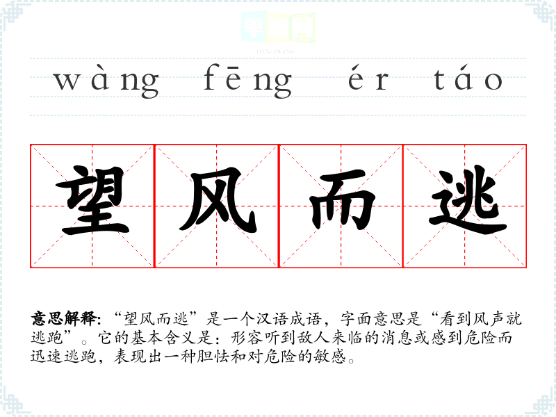 “望风而逃”是一个汉语成语,字面意思是“看到风声就逃跑”。它的基本含义是:形容听到敌人来临的消息或感到危险而迅速逃跑,表现出一种胆怯和对危险的敏感。