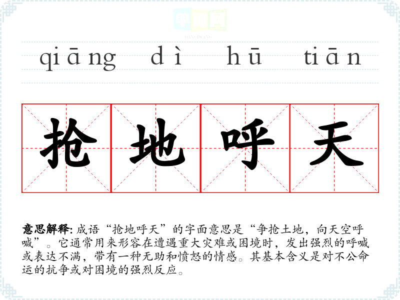 抢地呼天 抢地:触地。大声叫天,用头撞地。形容极度悲伤。