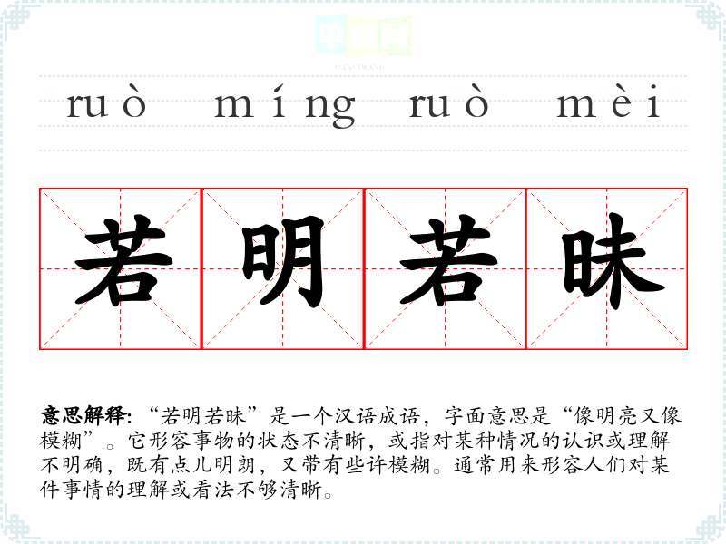 “若明若昧”是一个汉语成语,字面意思是“像明亮又像模糊”。它形容事物的状态不清晰,或指对某种情况的认识或理解不明确,既有点儿明朗,又带有些许模糊。通常用来形容人们对某件事情的理解或看法不够清晰。