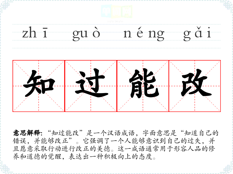 “知过能改”常用于日常对话、教育场合、演讲等。比如在教师对学生的评价中,鼓励学生在犯错后能够及时改正;在职场中,用于表扬员工的改进态度;在文学作品中,可以作为人物成长和转变的重要标志。