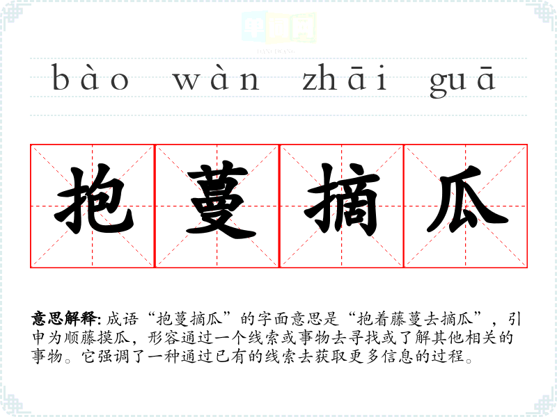 成语“抱蔓摘瓜”的字面意思是“抱着藤蔓去摘瓜”,引申为顺藤摸瓜,形容通过一个线索或事物去寻找或了解其他相关的事物。它强调了一种通过已有的线索去获取更多信息的过程。
