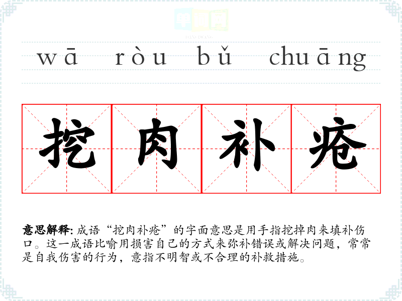 成语“挖肉补疮”的字面意思是用手指挖掉肉来填补伤口。这一成语比喻用损害自己的方式来弥补错误或解决问题,常常是自我伤害的行为,意指不明智或不合理的补救措施。
