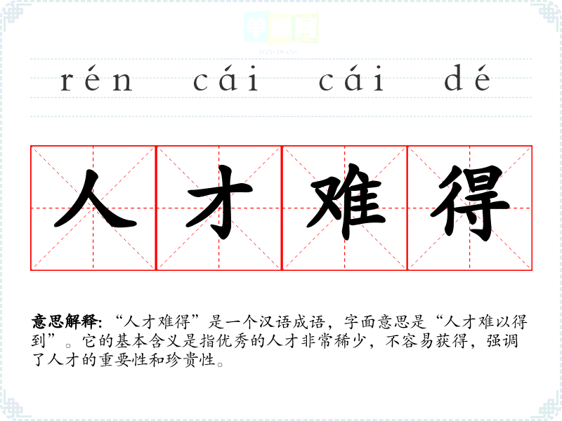 “人才难得”是一个汉语成语,字面意思是“人才难以得到”。它的基本含义是指优秀的人才非常稀少,不容易获得,强调了人才的重要性和珍贵性。