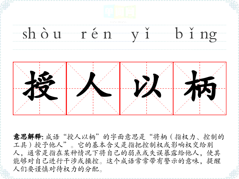 成语“授人以柄”的字面意思是“将柄(指权力、控制的工具)授予他人”。它的基本含义是指把控制权或影响权交给别人,通常是指在某种情况下将自己的弱点或失误暴露给他人,使其能够对自己进行干涉或操控。这个成语常常带有警示的意味,提醒人们要谨慎对待权力的分配。