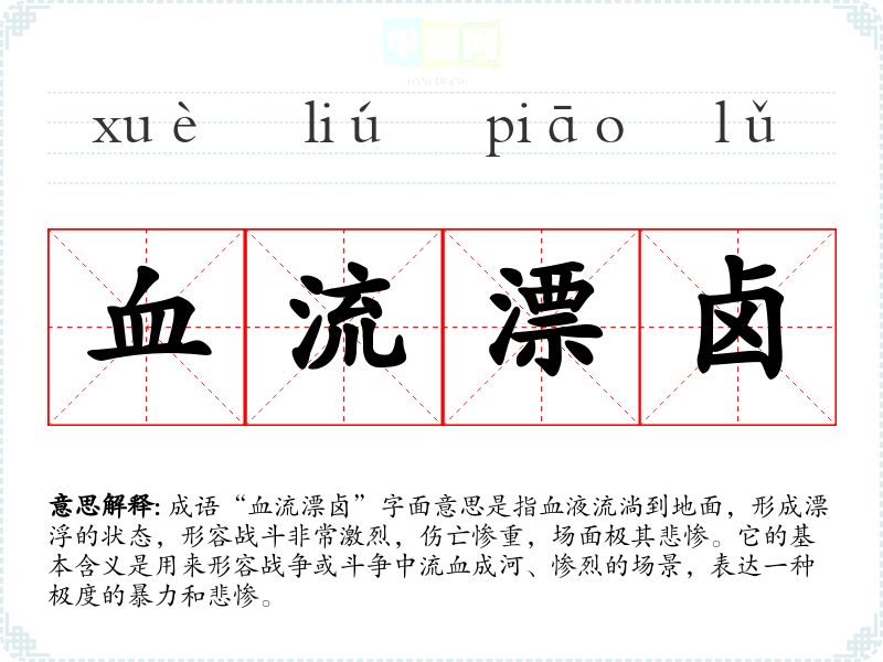 | 血流漂卤 | 卤:通“橹”,大盾。血流成河能把大盾漂浮起来。形容杀人很多 |