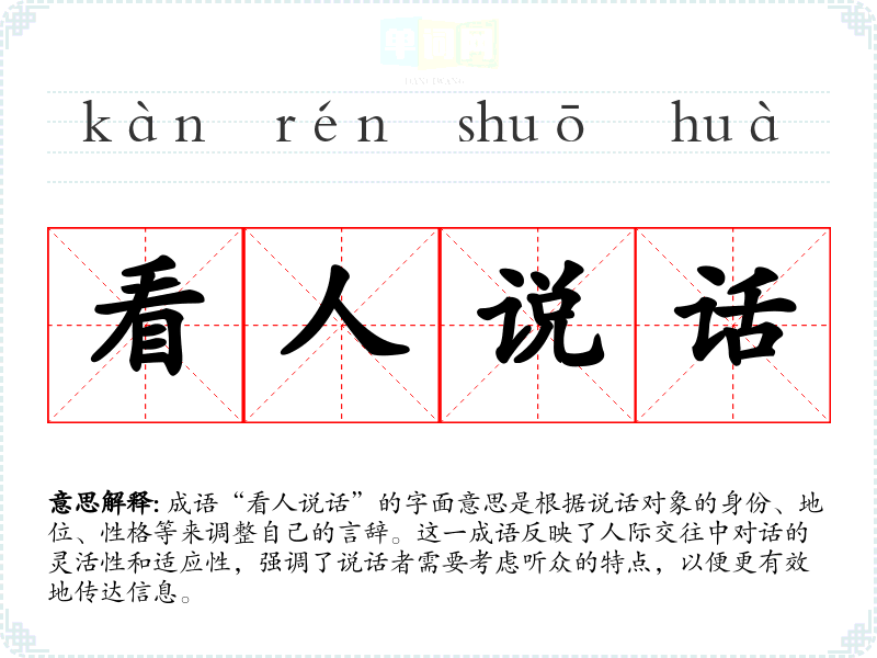 成语“看人说话”的字面意思是根据说话对象的身份、地位、性格等来调整自己的言辞。这一成语反映了人际交往中对话的灵活性和适应性,强调了说话者需要考虑听众的特点,以便更有效地传达信息。